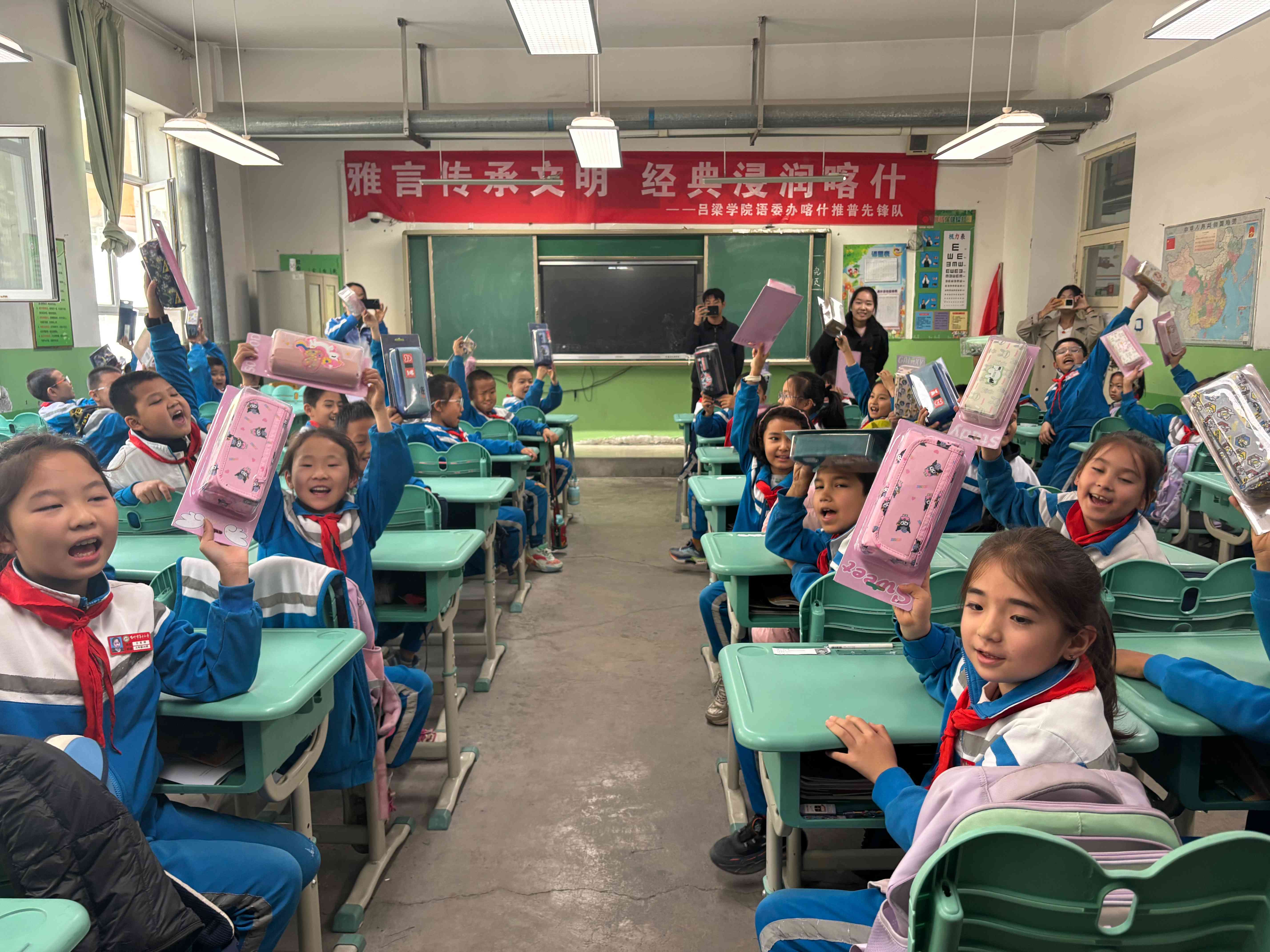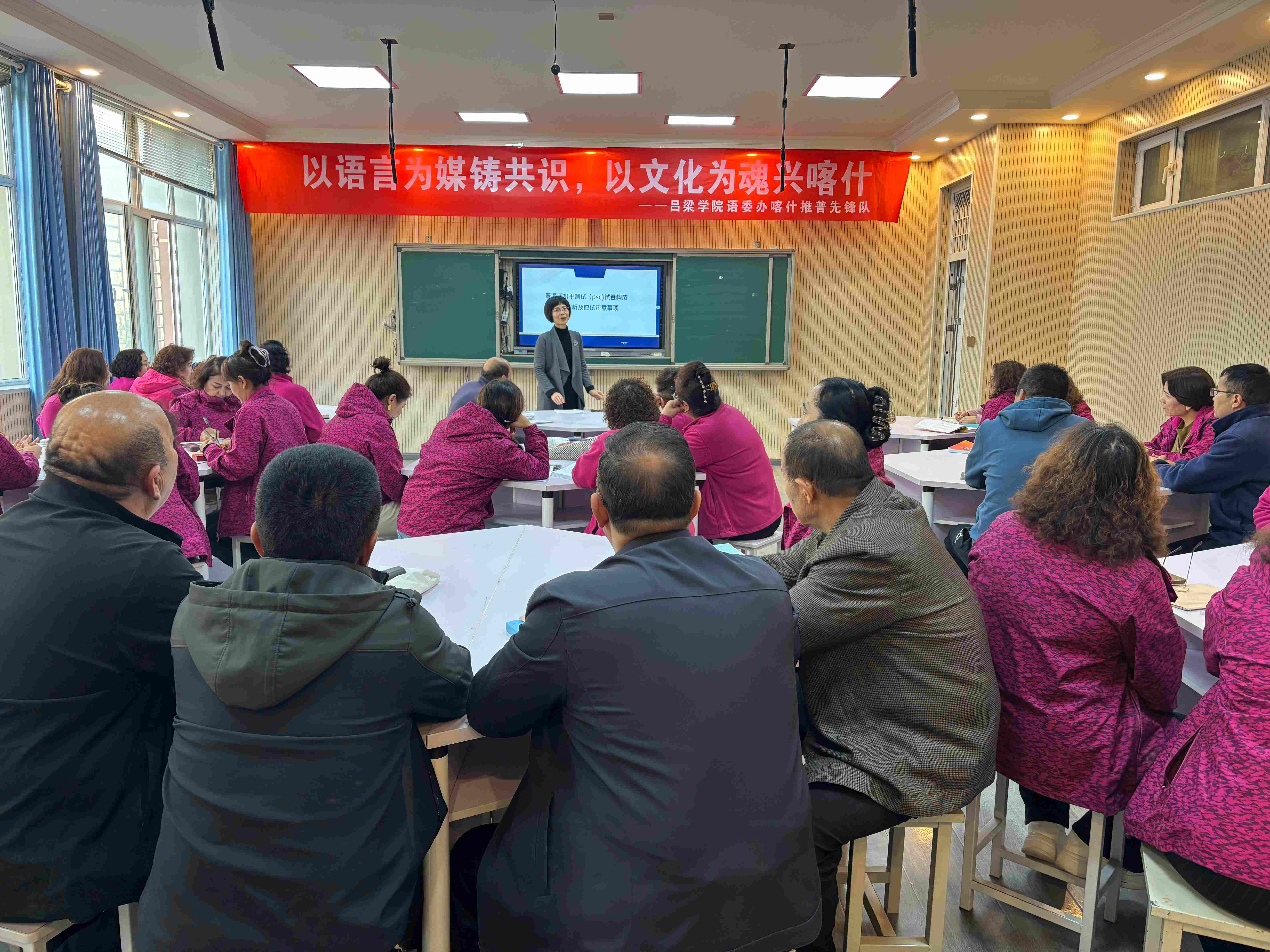 签约仪式后,省级测试员方锐锐为喀什市第九中学教师做了题为“普通话水平测试(PSC)试卷构成深度解析及应试注意事项”的专题讲座和培训,推普小分队成员与喀什市第十小学学生开展沉浸式普通话交流活动,并为他们送上礼物。