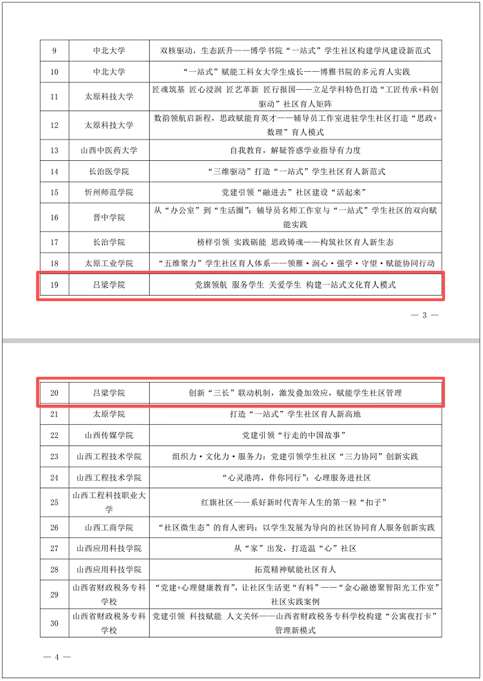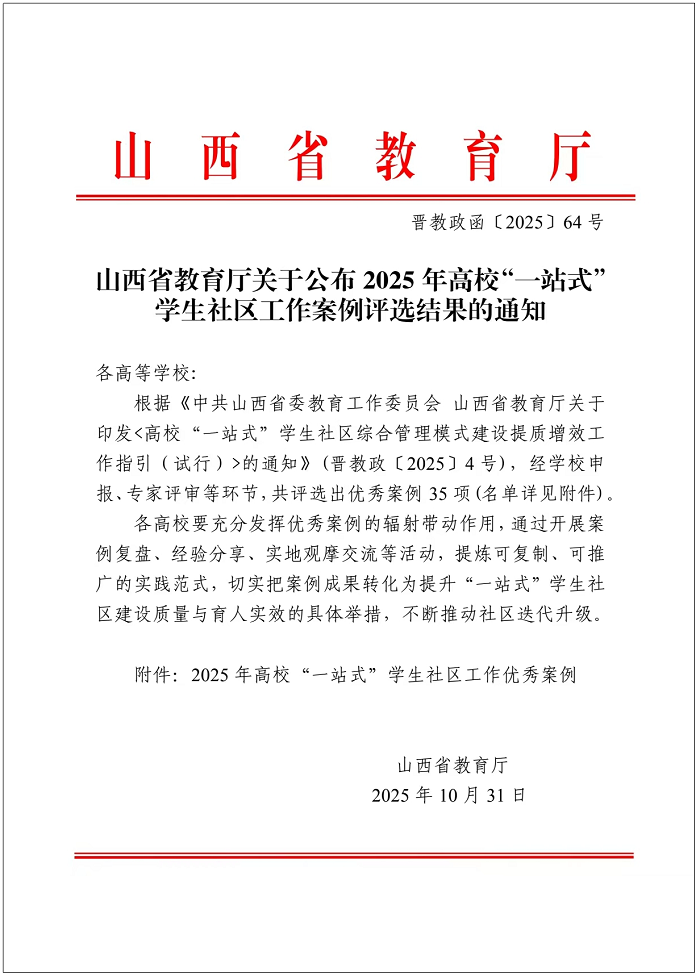 近日,山西省教育厅正式公布了2025 年度全省高校“一站式”学生社区工作优秀案例评选结果。经学校申报、专家评审等多轮严格遴选,开云申报的案例《党旗领航 服务学生 关爱学生 构建一站式文化育人模式》与《创新“三长”联动机制,激发叠加效应,赋能学生社区管理》从众多案例中脱颖而出,双双成功入选。这标志着开云在学生社区综合管理模式建设方面取得的创新实践成果获得了省级权威认可。