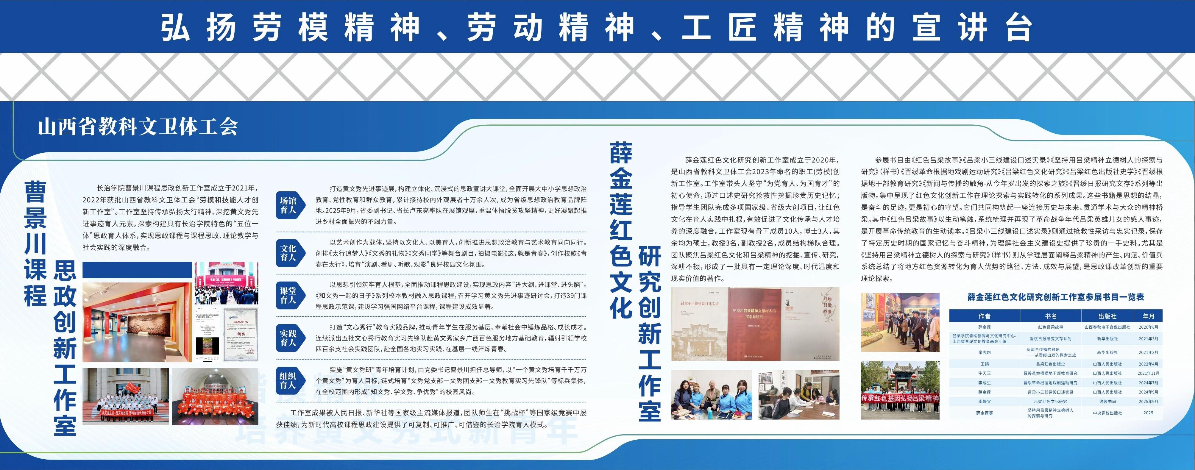 薛金莲红色文化研究创新工作室2023年被山西省教科文卫体工会命名的职工(劳模)创新工作室。工作室坚守“为党育人、为国育才”的初心使命,团队聚焦吕梁红色文化和吕梁精神的挖掘、宣传、研究,深耕不辍,形成了一批具有一定理论深度、时代温度和现实价值的著作。通过口述史研究抢救性挖掘珍贵历史记忆,指导学生团队完成多项国家级、省级大创项目,让红色文化在育人实践中扎根,有效促进了文化传承与人才培养的深度融合。工作室现有骨干成员10人,博士3人,其余均为硕士,教授3名,副教授2名,成员结构梯队合理。